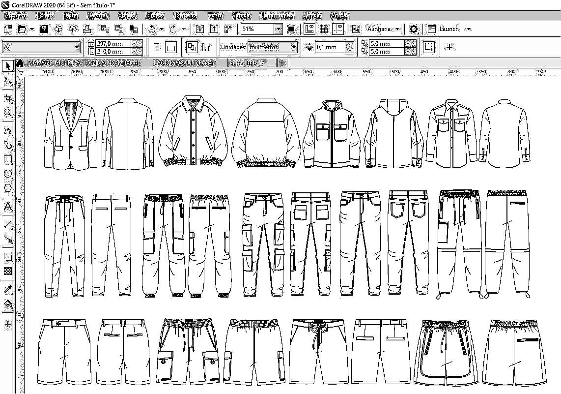 Você recebe mais de 100 desenhos técnicos masculinos, frente e costas, prontos para edição.