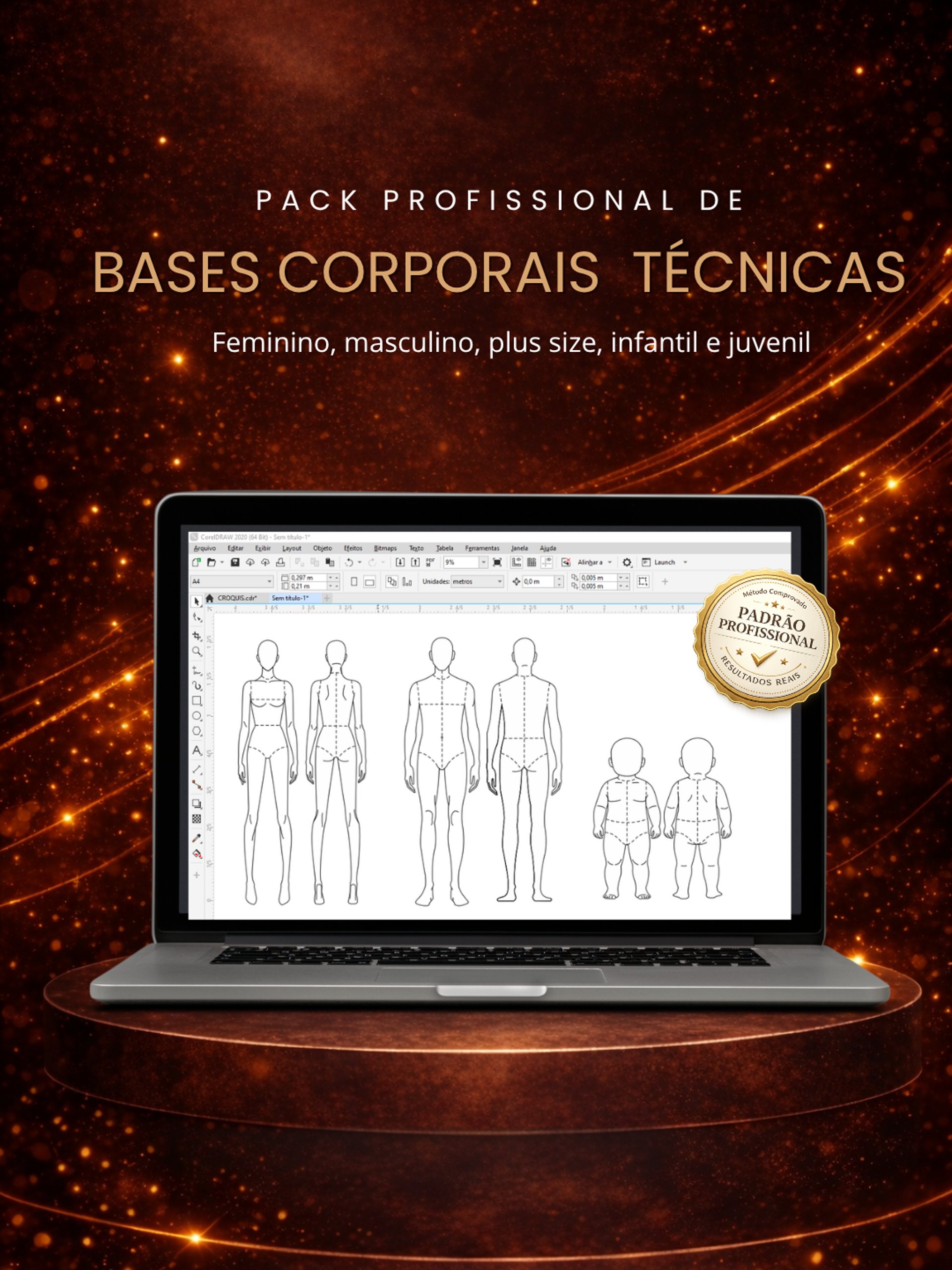 Com o pack de croquis, você tem acesso a bases corporais prontas — femininas, masculinas, plus size, infantil e juvenil — organizadas para você aplicar suas criações com mais rapidez e precisão.